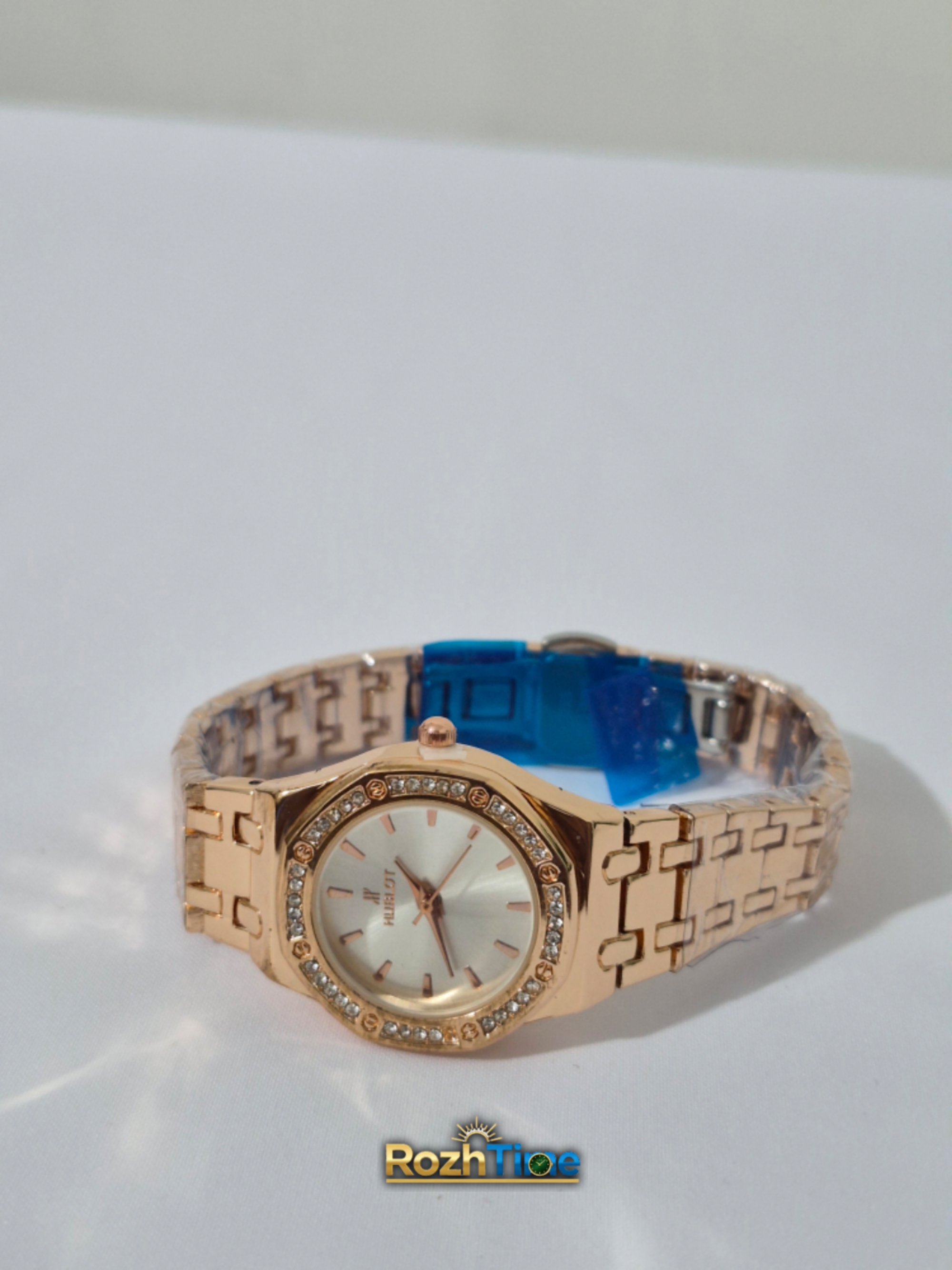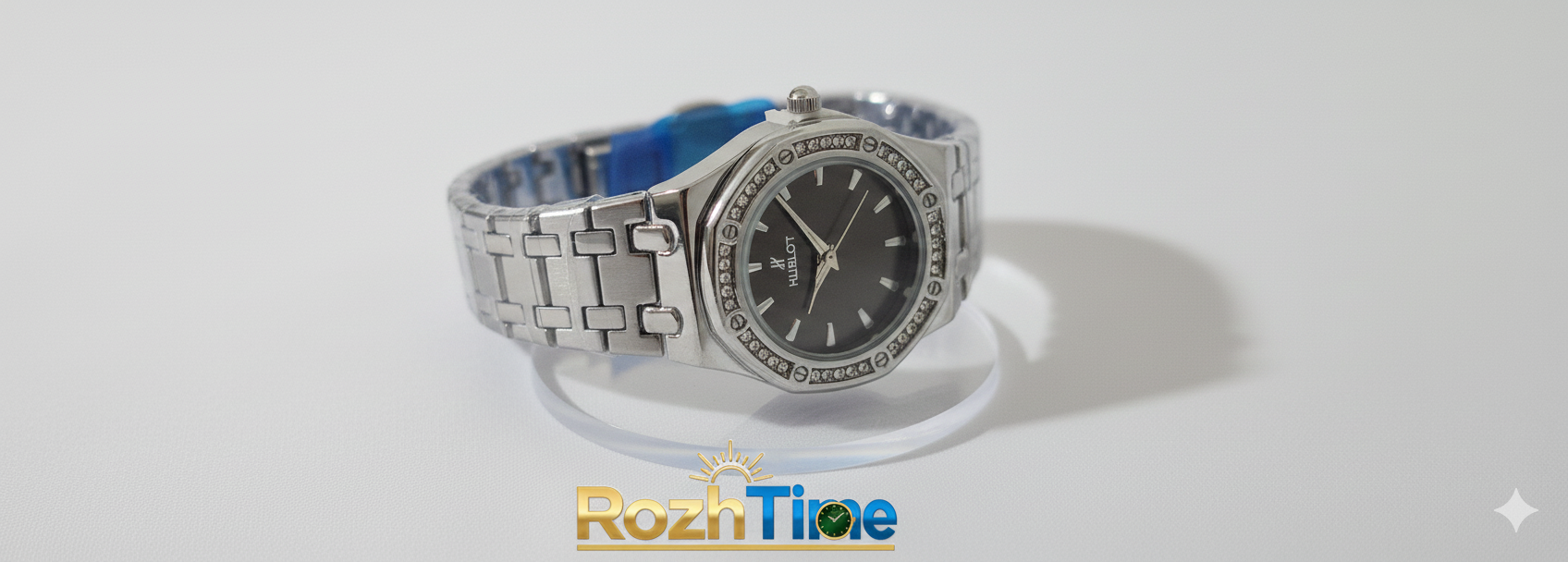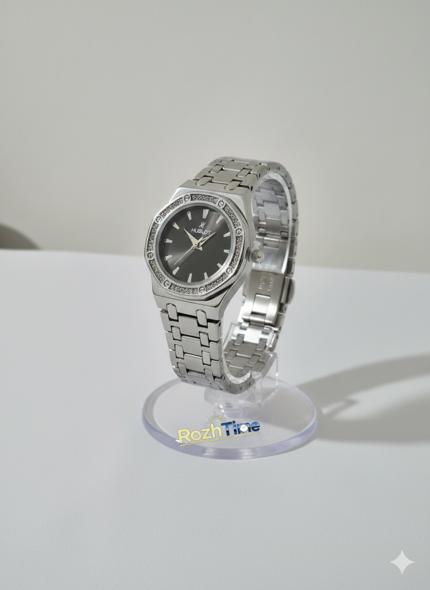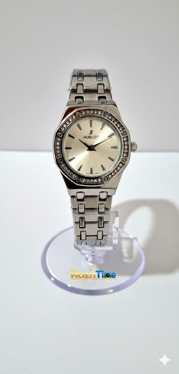* صفحه نمایش: صفحه نقرهای (یا شامپاینی) با نشانگرهای ساده و لوگوی برجسته HUBLOT (یا طرح مشابه)، برای خوانایی آسان و ظاهری مینیمال و شیک.