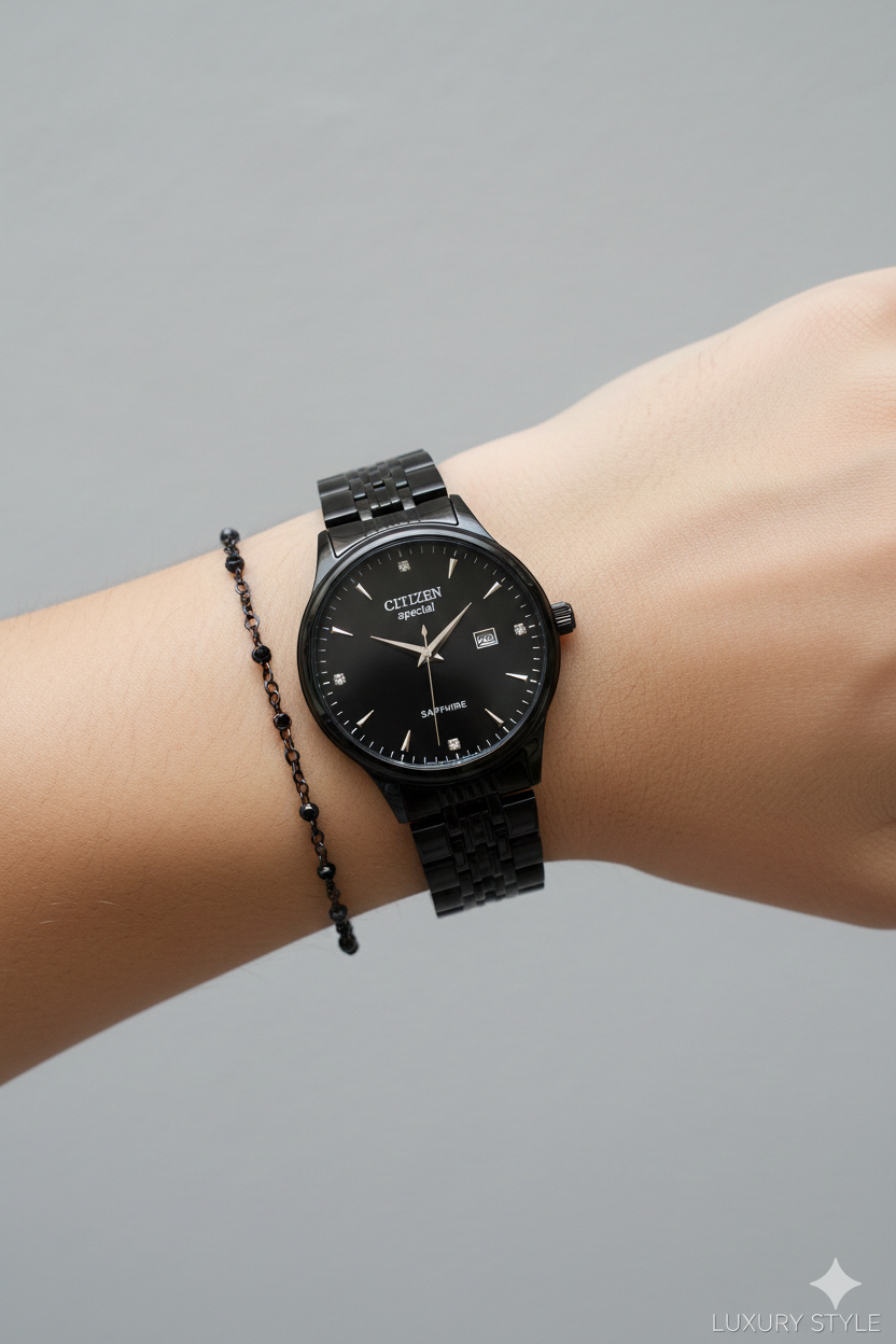 اگر به دنبال ساعتی هستید که در عین سادگی، قدرتمند و خاص به نظر برسد، این ست تمام مشکی از برند سیتیزن دقیقاً همان چیزی است که استایل شما را کامل میکند. برخلاف ساعتهای معمولی، رنگ مشکی این مدل با تکنولوژی رنگ ثابت پوشش داده شده که ترکیبی از بخشهای مات و براق را در بند استیل خود جای داده است؛ این تضادِ بافت، باعث میشود ساعت در زیر نور، درخششی عمیق و مجلل داشته باشد.